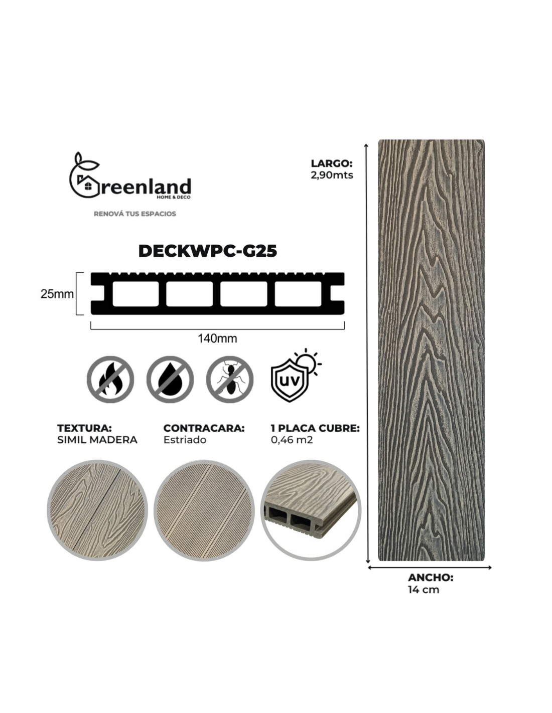 WPS (Wood Plastic Composite) de 4* generación es un compuesto de madera y plástico con una cobertura de 360*, muy resistente a las condiciones de exterior. Nuestros productos tienen textura y aspecto similar a la madera, pero con mayor durabilidad y no requieren mantenimiento.
